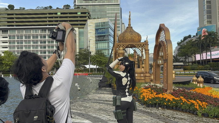 Satu orang yang menikmati kesibukan Jakarta berkurang adalah Yujitea. Dia tiba di Bundaran HI sambil membawa perlengkapan kameranya. Tak hanya itu, dia juga mengundang seorang cosplayers untuk jadi model foto bersamanya.